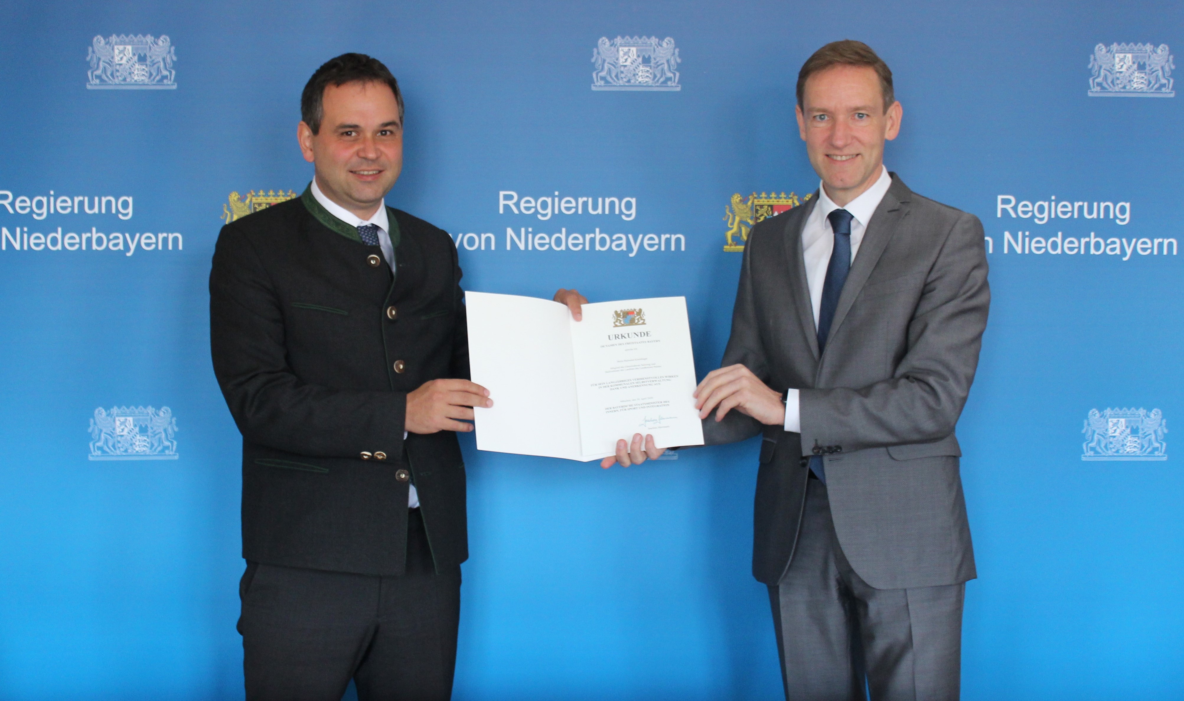 Regierungspräsident Rainer Haselbeck (rechts) überreicht Landrat Raimund Kneidinger (links) die kommunale Dankurkunde.