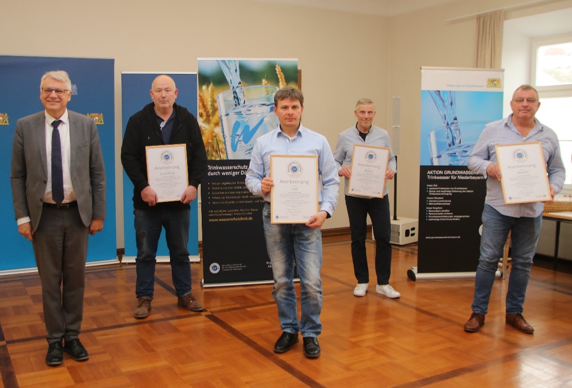 (von links): Regierungsvizepräsident Dr. Helmut Graf überreicht den Bäckern Johann Geisenfelder (Bäckerei Geisenfelder), Jakob Hatzl (Bäckerei Hatzl), Rudolf Bücherl (Bäckerei Bücherl) und Manfred Keilwerth (Bäckerei Wackerl) eine Urkunde, die ihre Bäckerei als Wasserschutzbäckerei auszeichnet.