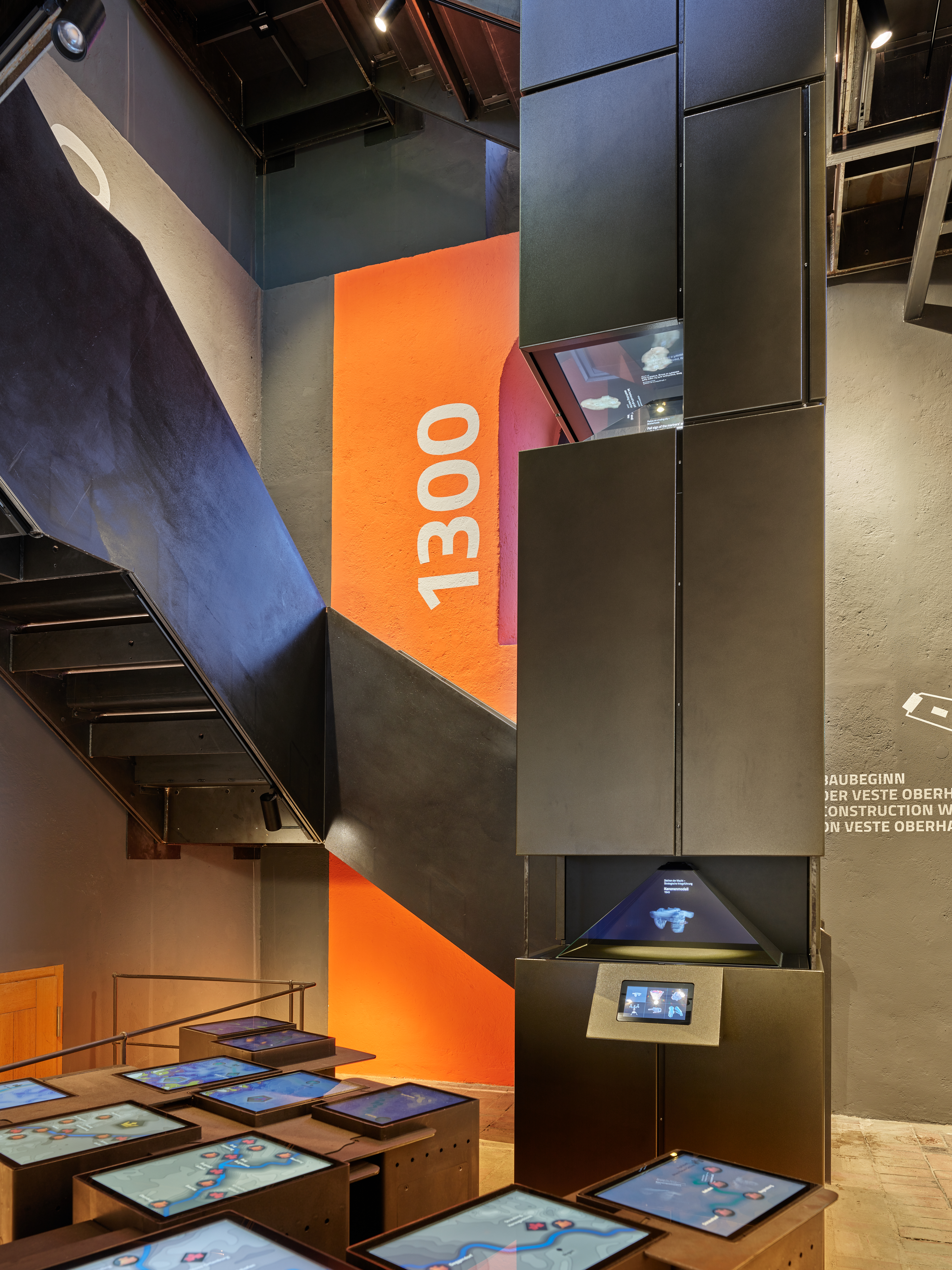 Bereits während des Aufstiegs entlang der neu gestalteten Stahlwendeltreppe ergänzt ein Zeitstrahl das Ausstellungskonzept, in der die Historie der Veste Oberhaus dargestellt wird. Die moderne digitale Ausstellung bietet den Besuchern Einblick in die Entstehungsgeschichte der Veste ab dem 13. Jahrhundert sowie der wirtschaftlichen Entwicklung des historischen Inn-Salzach-Donauraums.