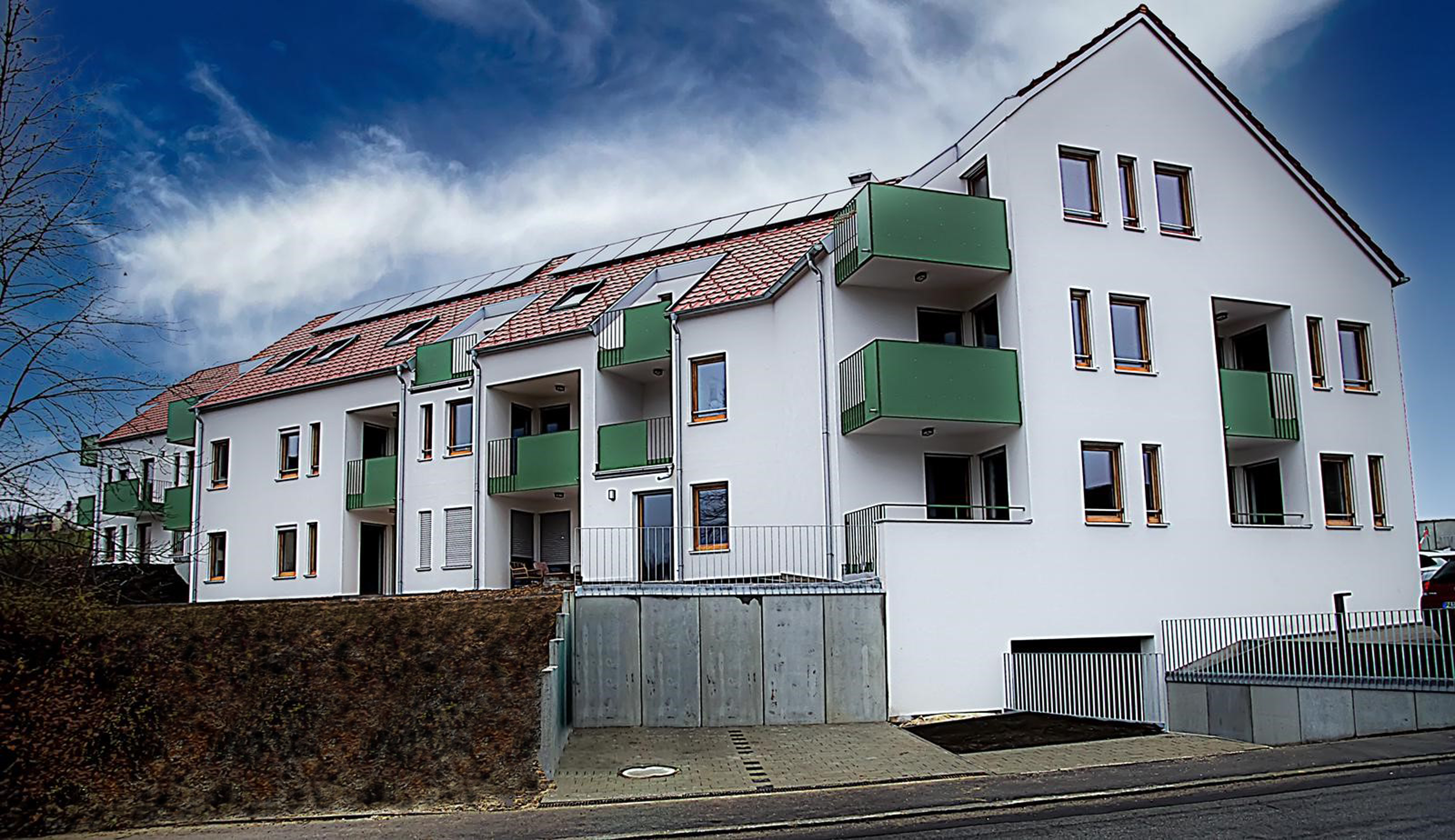 Das Grundstück im Ortsteil Heining war schon länger im Besitz der Wohnungs- und Grundstücksgesellschaft mbH Passau, aber auf Grund des Zuschnittes und der Topografie nicht einfach zu bebauen. Dennoch entschloss man sich nun, den benachbarten eigenen Wohnungsbestand um weitere 27 Einheiten zu ergänzen und bezahlbaren Wohnraum für Mieter mit geringem Einkommen zu schaffen. Zum Großteil handelt es sich um sehr kleine Wohnungen für ein bis zwei Personen. Die Grundrisse wurden hinsichtlich der Fläche optimiert. Damit gibt es keine Einbußen bei der Wohnqualität trotz sehr kleiner Wohnfläche. So hat auch jede der Wohneinheiten entweder eine Terrasse, einen Balkon oder eine Loggia. Die Wohnungen sind barrierefrei und über Aufzüge erschlossen, sodass sie auch gut für Personen mit eingeschränkter Mobilität geeignet sind.