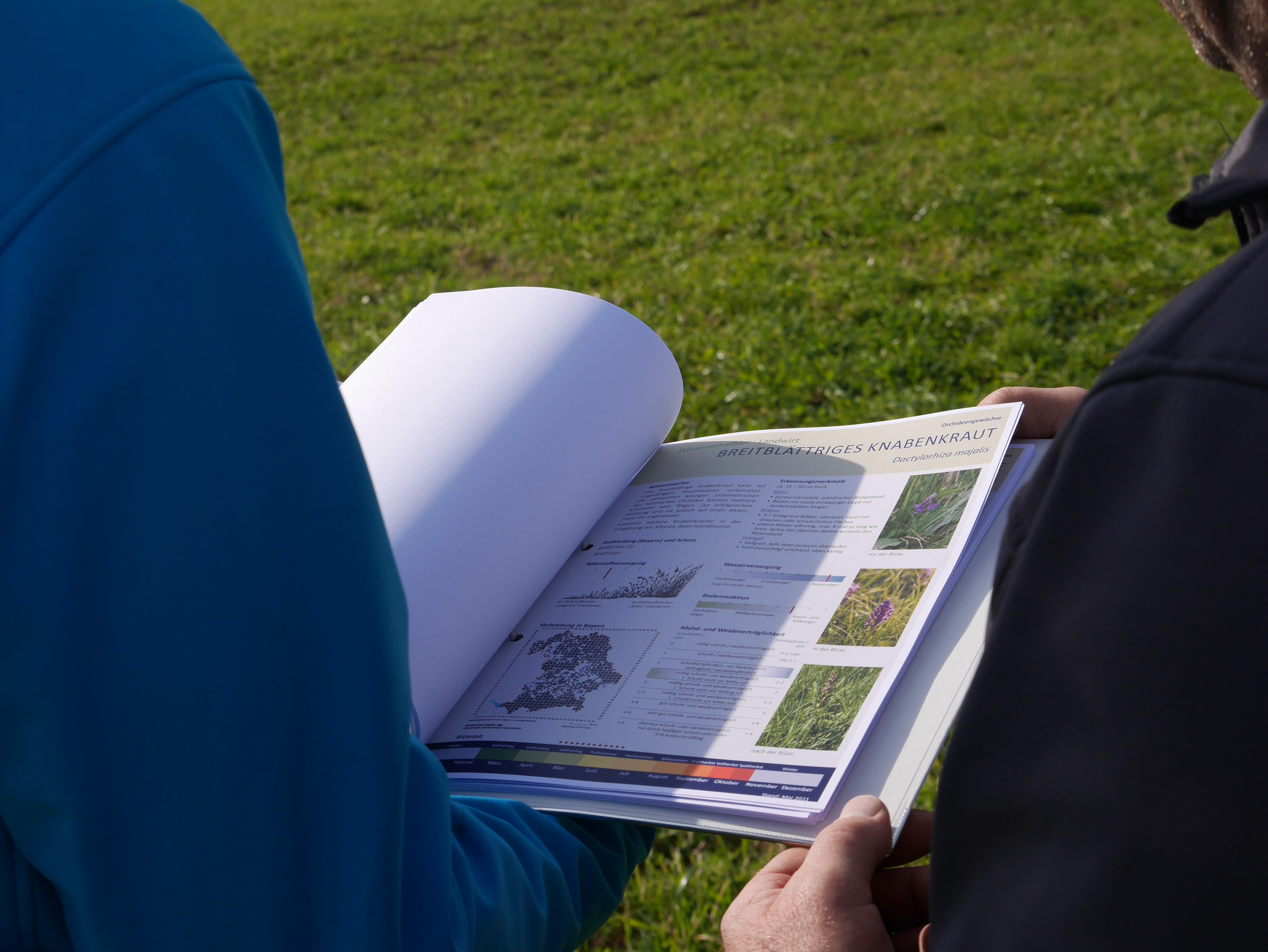 Ob er nun einen Biodiversitätsberater auf dem Hof brauchen kann, da war sich der Landwirt anfangs noch nicht so sicher. „Aber neugierig war ich, vor allem auf das, was da auf meinem Hof herauskommt.“ Der junge Martin Mall brachte bei seinem ersten Besuch drei Metallpflöcke mit. Und rammte sie an verschiedenen Stellen bodeneben in das Gras. Fünf Meter um diese Pflöcke liegt nun die sogenannte „Dauerbeobachtungsfläche“. In diesem Radius wird die Tier- und Pflanzenwelt ganz genau unter die Lupe genommen. Am besten über Jahre hinweg. Wie verändert sich die Zusammensetzung der Arten unter unterschiedlichen Umweltbedingungen, durch Trockenheit oder bei anderer Nutzung? Das wird laufend beobachtet. Dazu haben die beiden Profis beim ersten Treffen die Zeigerarten ausgewählt, auf denen das Augenmerk bei der Zählung gelegt werden soll. Der Bauer erklärt dazu, wie er die Wiese bewirtschaften wird. Ein großer Ordner mit Informationsmaterialien zu den verschiedenen Pflanzenarten hilft Bernhard Lüftl dabei, die Arten zukünftig selbstständig zu beobachten und zu bestimmen. Lüftl füllt die bereitgestellten Erhebungsbögen jedes Jahr aus und reicht sie bis Ende Oktober bei der Regierung ein.