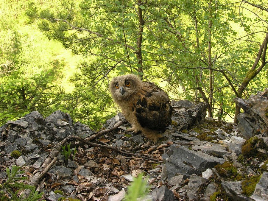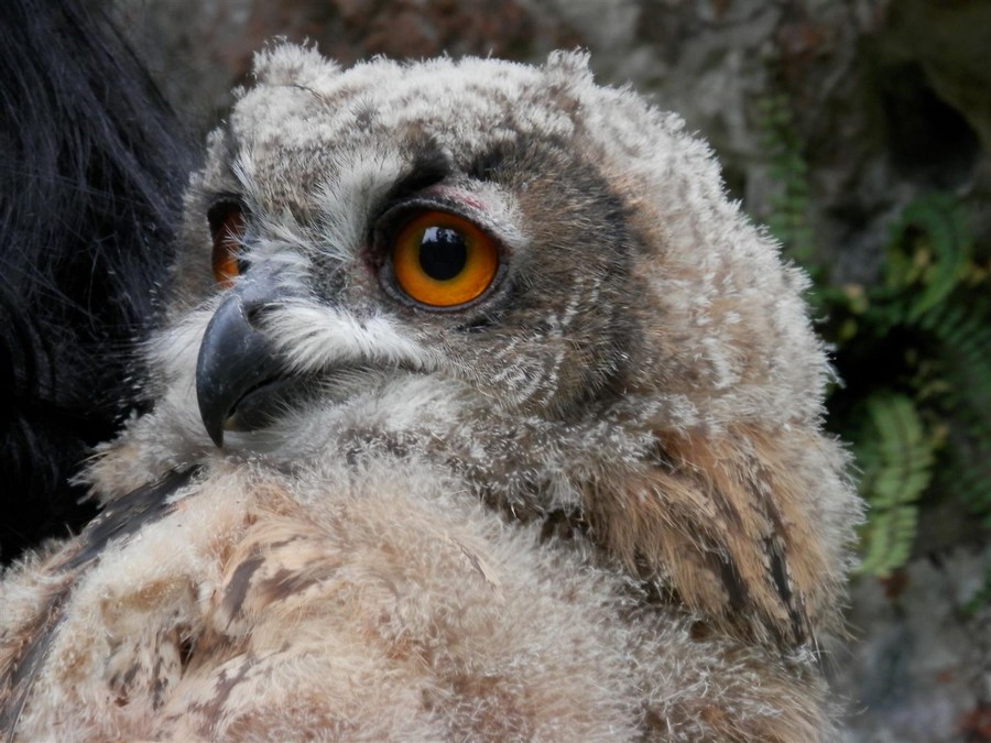 Ein junger Uhu – gut erkennbar an seinem Federkleid. Auf der Brust und am Kopf sind die Daunenfedern noch gut sichtbar.