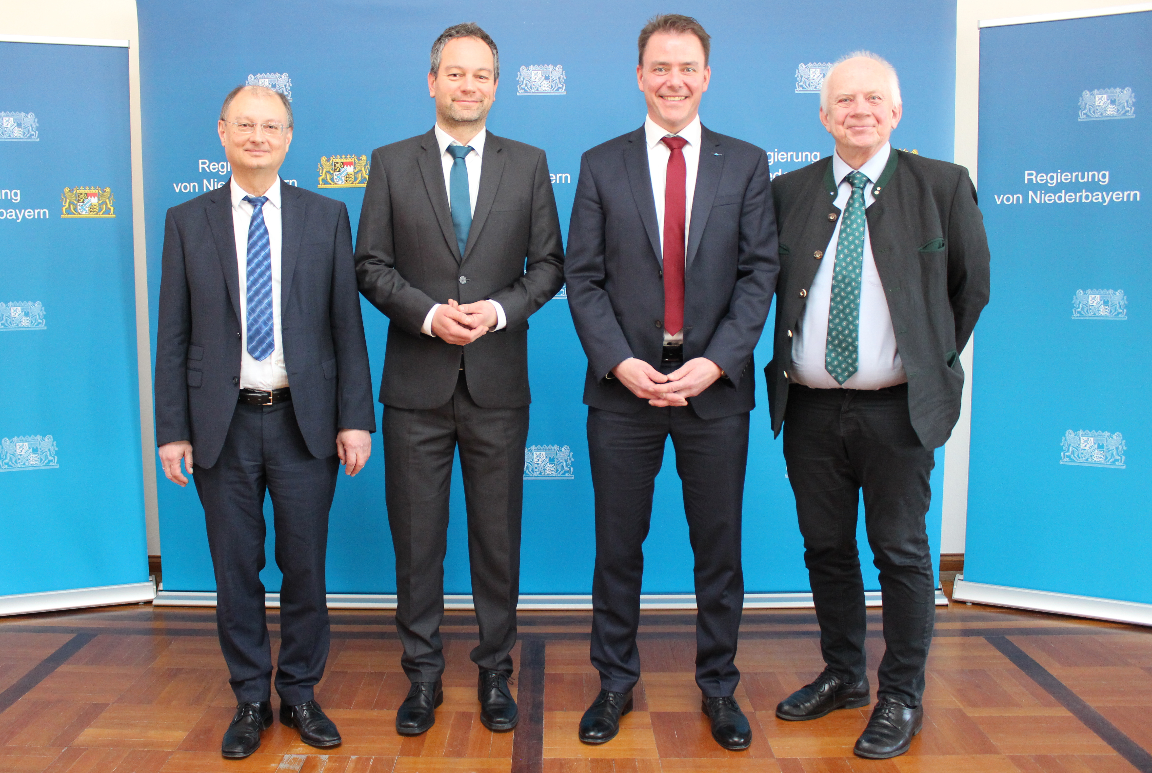 Stabwechsel am Wasserwirtschaftsamt: Der neue Leiter Patrik Giebel (Zweiter von rechts) gemeinsam mit seinem Vorgänger Constantin Sadgorski (Zweiter von links). Der Leiter des Bereiches „Umwelt, Gesundheit und Verbraucherschutz“ der Regierung von Niederbayern, Manfred Pfandl (links), sowie der Leiter der Abteilung „Wasserwirtschaft und Bodenschutz“ am Staatsministerium für Umwelt und Verbraucherschutz, Prof. Dr. Martin Grambow, wünschten Giebel und Sadgorski für ihre neuen Aufgaben viel Erfolg.