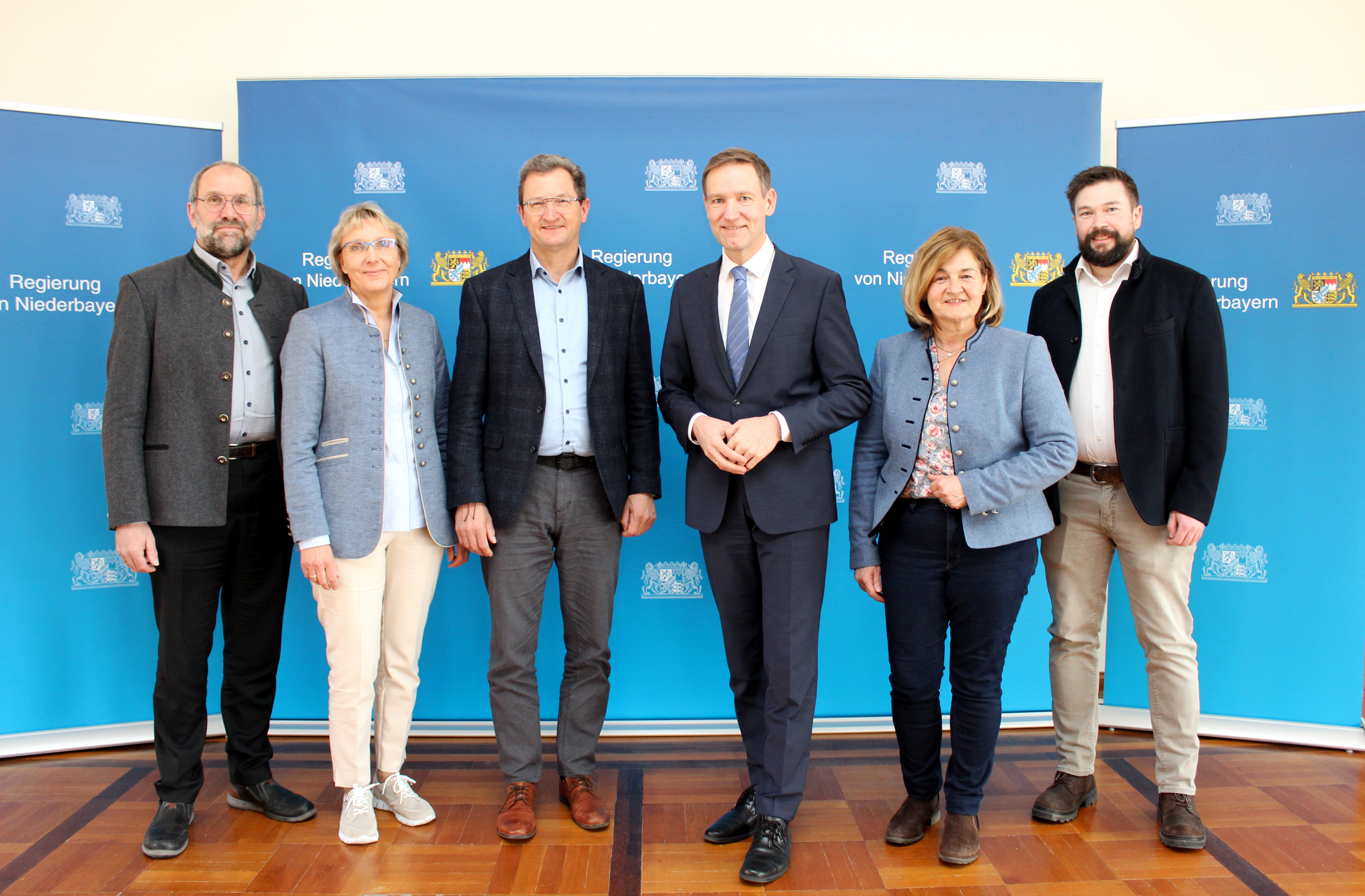 Das Foto zeigt (von links) seitens des Bayerischen Bauernverbandes (BBV), Hauptgeschäftsstelle Niederbayern, Direktor Peter Huber, die Bereichsleiterin „Ernährung und Landwirtschaft“ an der Regierung von Niederbayern, Franziska von Krezmar, BBV-Bezirkspräsident Niederbayern, Siegfried Jäger, Regierungspräsident von Niederbayern, Rainer Haselbeck, die stellvertretende Bezirksbäuerin Niederbayern, Rosmarie Mattis, sowie den stellvertretenden BBV-Bezirkspräsidenten Niederbayern, Sebastian Dickow.