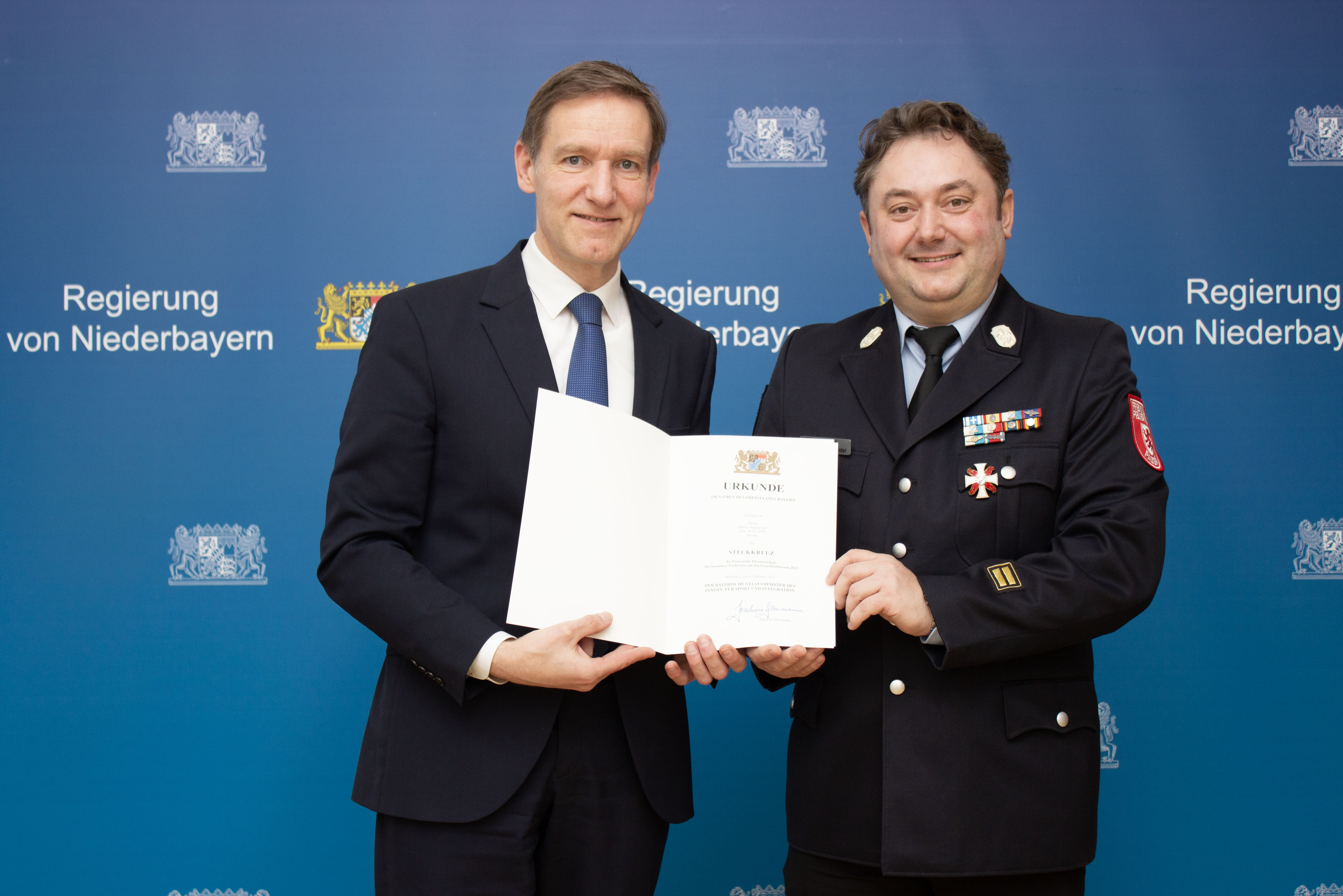„Sie haben sich mit Ihrer Leistung in besonderer Weise um das Feuerwehrwesen verdient gemacht. Es freut mich sehr, Ihnen diese hohe Auszeichnung als Dank für Ihr herausragendes Engagement überreichen zu dürfen“, sagte der Regierungspräsident bei der Übergabe des Feuerwehr-Steckkreuzes und betonte: „Danke für Ihren bedeutenden Einsatz. Danke für ganz besonderes Vorbild.“