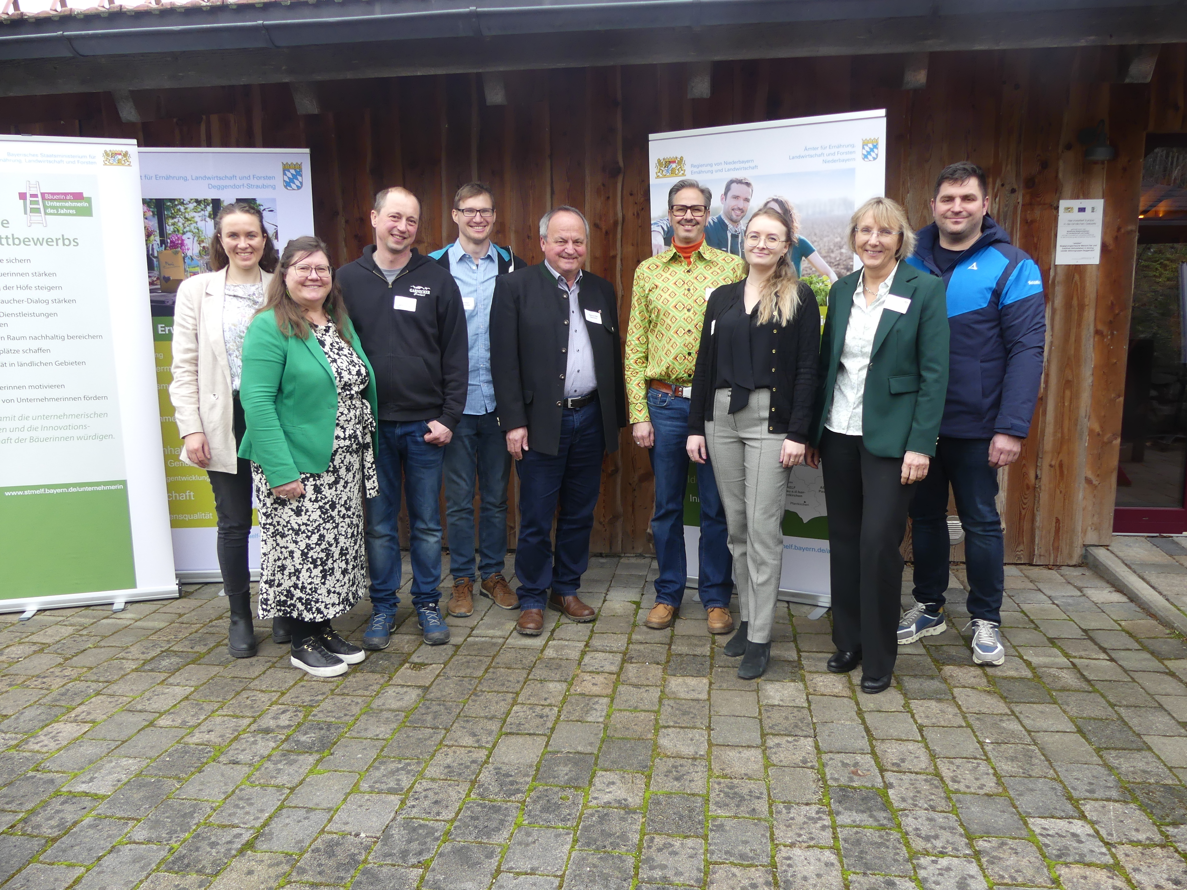 Die Referenten des „Niederbayerischen Direktvermarktertag“ freuen sich über die vielen interessierten Teilnehmer und den gelungenen Verlauf der Veranstaltung: (von links) Veronika Gruber vom AELF Regen, Heidi Gegenfurtner vom AELF Abensberg-Landshut, die Direktvermarkter Thomas Jetzlsperger, Maximilian Klughammer und Helmut Ettl, Daniel Kükenhöhner vom Beratungs- und Planungsbüro Petzinger, Kristina Hofmann von der Geschäftsstelle Bürokratieabbau in der Bayerischen Staatskanzlei, Franziska von Krezmar, Bereichsleiterin Ernährung und Landwirtschaft an der Regierung von Niederbayern, sowie Direktvermarkter Hans Grötzinger.
