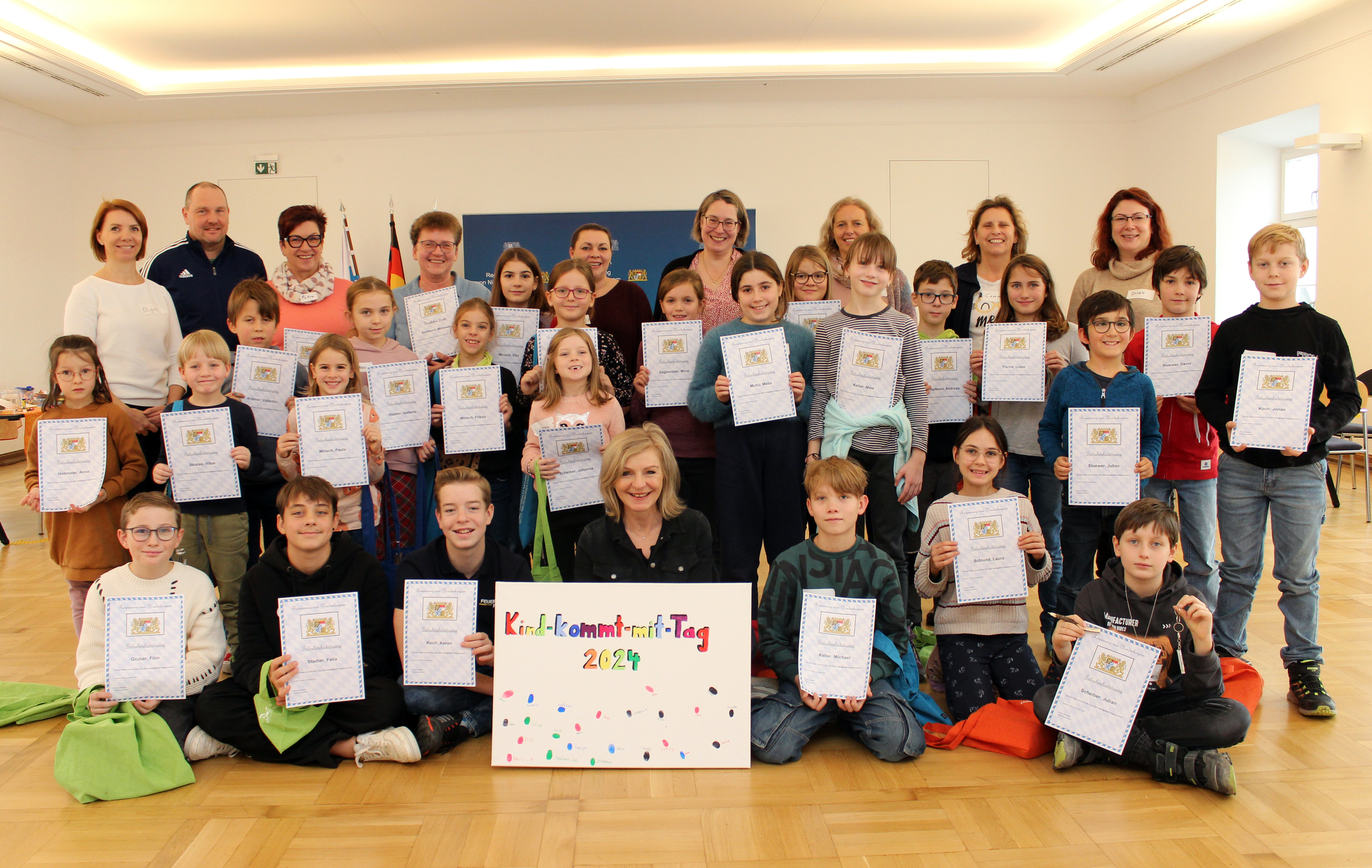 Viel Spaß hatten die Kinder der Beschäftigten an der Regierung von Niederbayern beim "Kind-kommt-mit-Tag". Stolz präsentieren sie ihre Urkunden, die ihnen Margit Nitsche (Mitte, sitzend) in Vertretung des Regierungspräsidiums als kleine Erinnerung an den Tag überreichte.