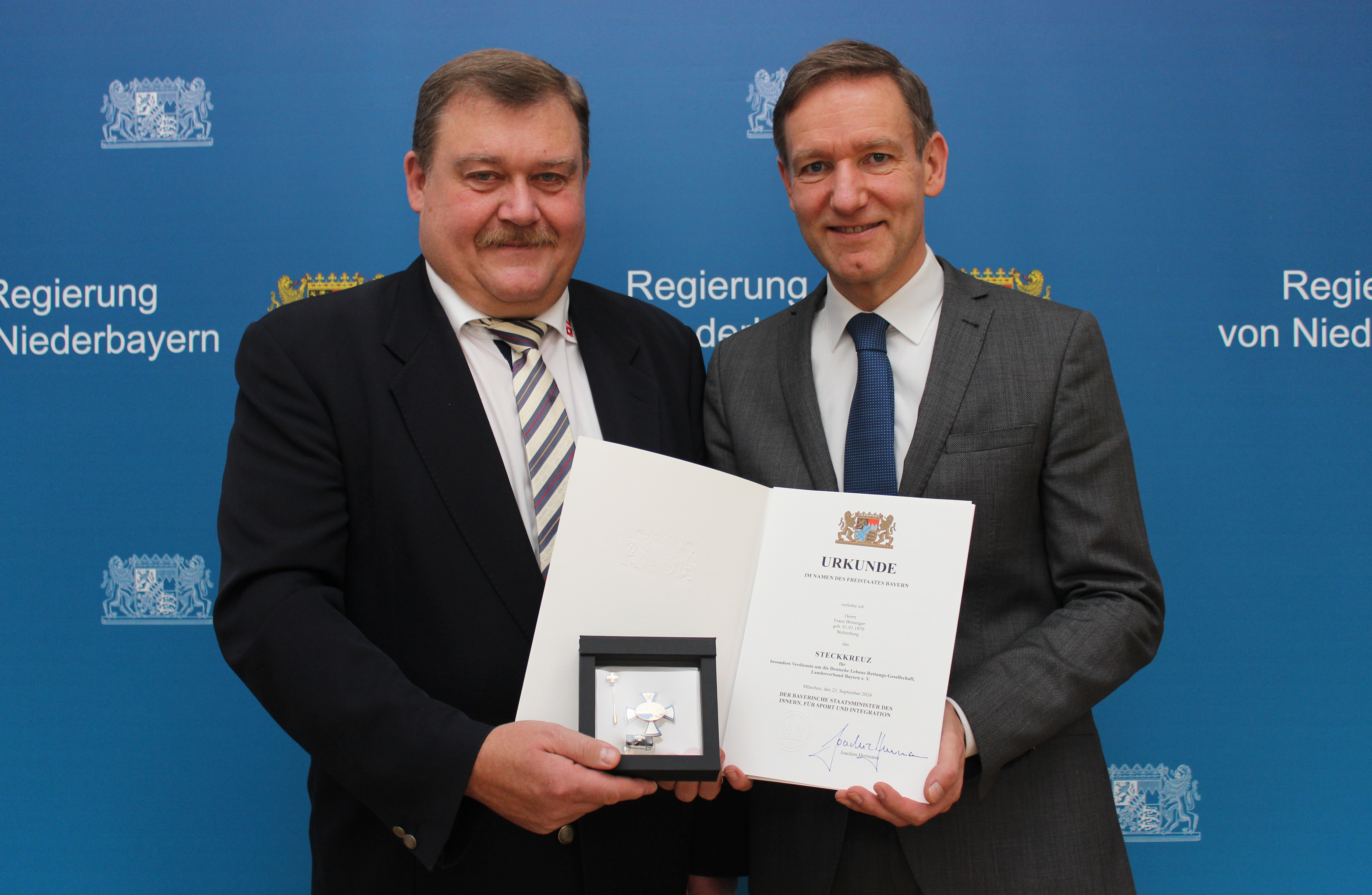 Hohe Auszeichnung des Freistaates Bayern: Regierungspräsident Rainer Haselbeck (rechts) zeichnet den Vorsitzenden des Bezirks Niederbayern der Deutschen Lebens-Rettungs-Gesellschaft (DLRG) Bayern, Franz Brosinger, mit dem „Steckkreuz für besondere Verdienste um die DLRG“ aus.
