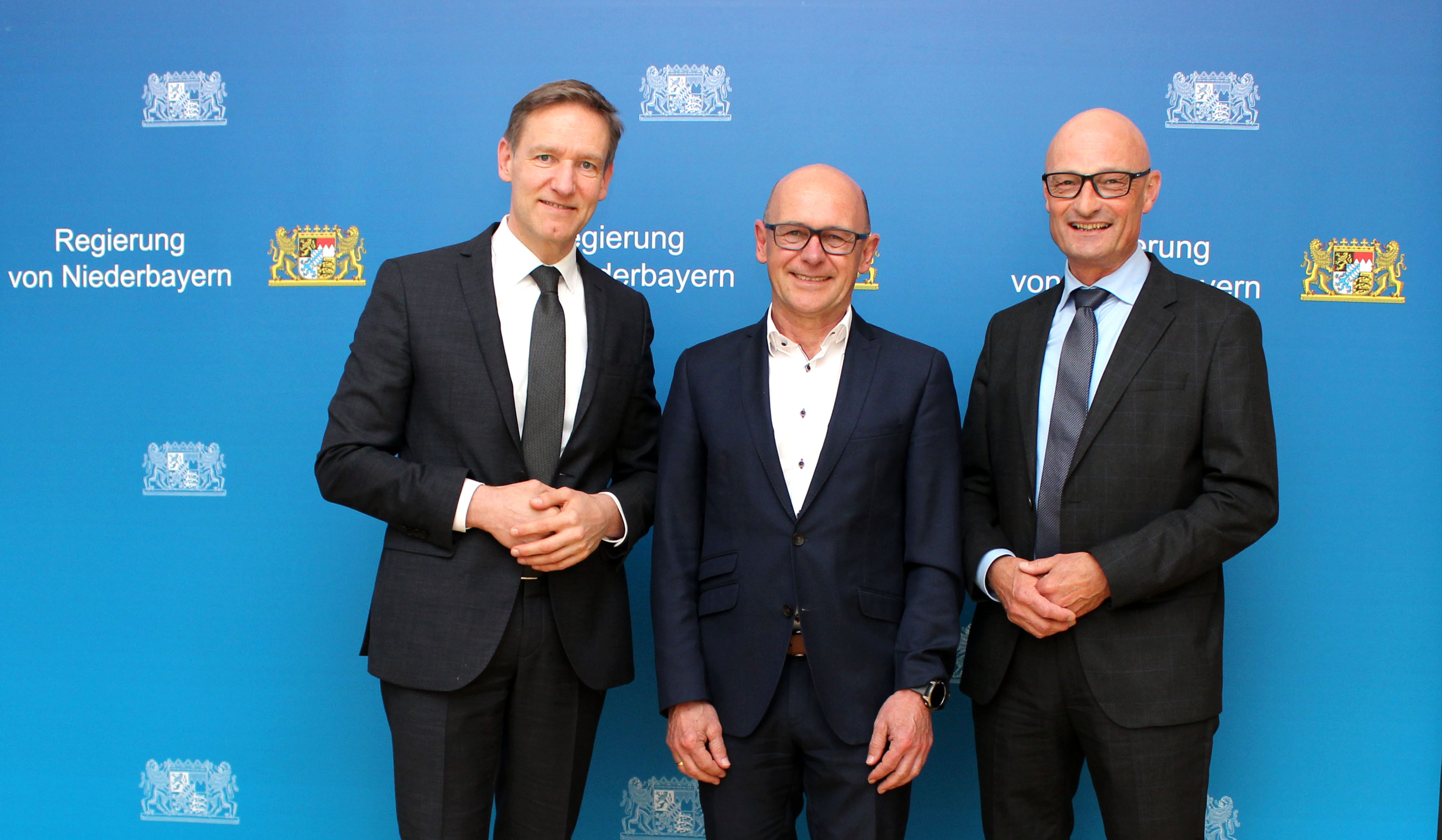 Antrittsbesuch an der Regierung von Niederbayern: Regierungspräsident Rainer Haselbeck (links) und der Bereichsleiter „Schulen“, Ralf Reiner (rechts), beglückwünschten den neuen fachlichen Leiter der Staatlichen Schulämter in der Stadt und im Landkreis Landshut, Sebastian Hutzenthaler, zu seiner neuen Position und wünschten ihm viel Erfolg.