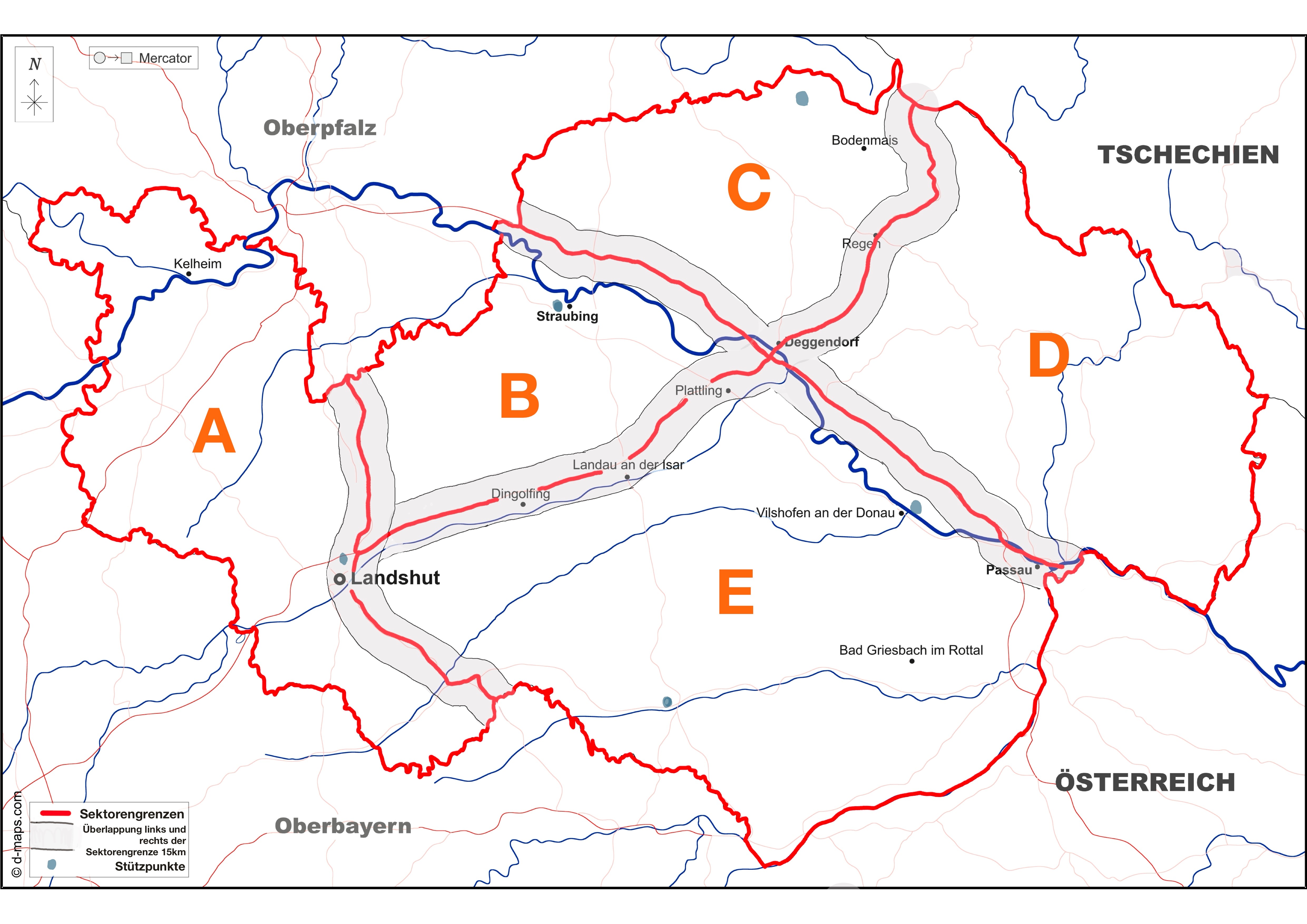 Am Freitag, 15. August, wird ab dem Stützpunkt Ellermühle, Landratsamt Landshut, in den Sektoren A und B geflogen sowie ab dem Stützpunkt Eggenfelden, Landratsamt Rottal-Inn, in den Sektoren C und D.