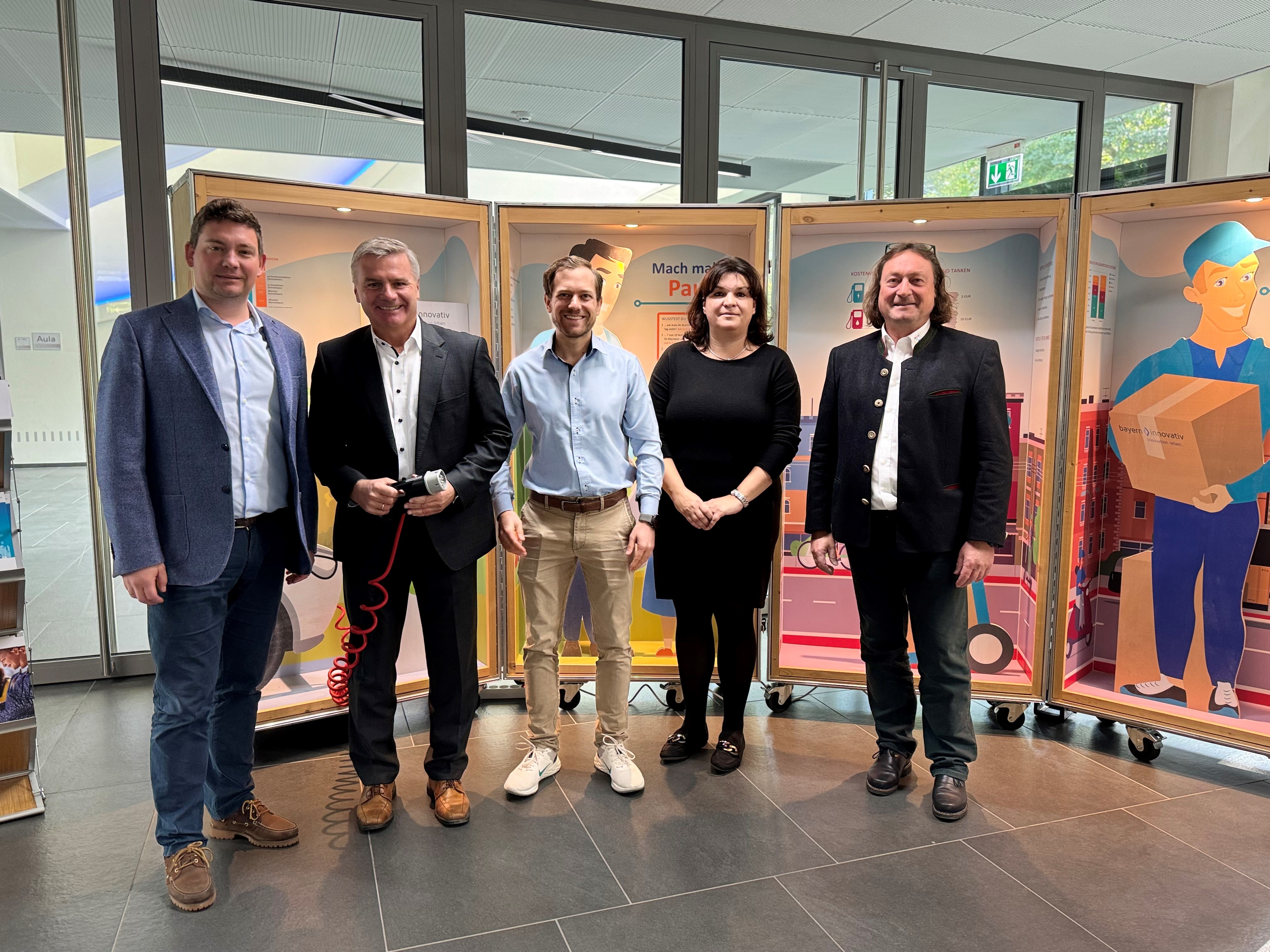 „E-Mobilität neu denken“ und vor Ort erleben: (von links) Landshuts Zweiter Bürgermeister Dr. Thomas Haslinger, Landrat Peter Dreier, Bastian Ritter, Projektmanager für Mobilität bei „Bayern Innovativ“, Manuela Königbauer, Bereichsleiterin „Wirtschaft, Landesentwicklung, Heimat und Verkehr“ der Regierung von Niederbayern, und Reinhold Ostermaier, Schulleiter der Staatlichen Berufsschule 1, bei der Eröffnung der interaktiven Wanderausstellung, die sich rund um die Mobilität von morgen dreht.