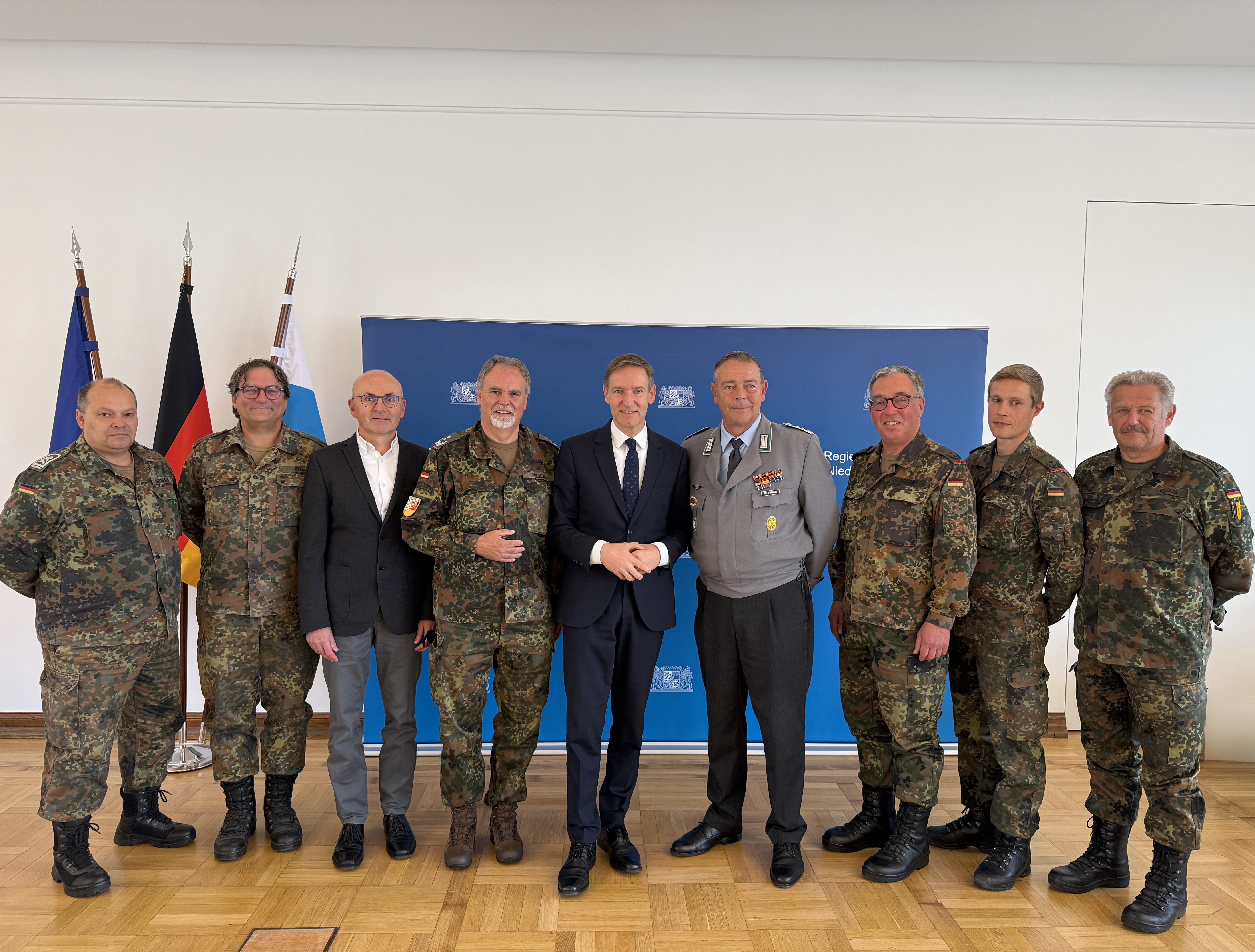 Im Katastrophenfall ist es ein entscheidendes Bindeglied in der Zusammenarbeit zwischen Bundeswehr und zivilen Einsatzstrukturen auf Ebene der Regierung: Das Bezirksverbindungskommando (BVK) Niederbayern. Laut Regierungspräsident Rainer Haselbeck „ein unverzichtbarer und stabiler Anker im Bevölkerungsschutz“, wie er am Montag bei einem gemeinsamen Austausch mit der BVK-Spitze hervorhob. Das Treffen an der Regierung bot zugleich den Rahmen für einen bedeutenden Anlass: Die Verabschiedung von Oberst der Reserve Stephan Wiesend, der dem BVK seit über fünf Jahren vorstand. Gleichzeitig wurde sein Nachfolger Oberst der Reserve Claus Schorn ins Amt eingeführt. Die Stabübergabe erfolgte – begleitet von Kameraden des niederbayerischen Verbindungskommandos – durch den stellvertretenden Kommandeur des Landeskommandos Bayern, Oberst Martin Seebörger, im Beisein des Regierungspräsidenten und dem Leiter „Sicherheit und Ordnung“ der Regierung, Robert Meier, die dem scheidenden und neuen BVK-Leiter ihre Wertschätzung zollten.