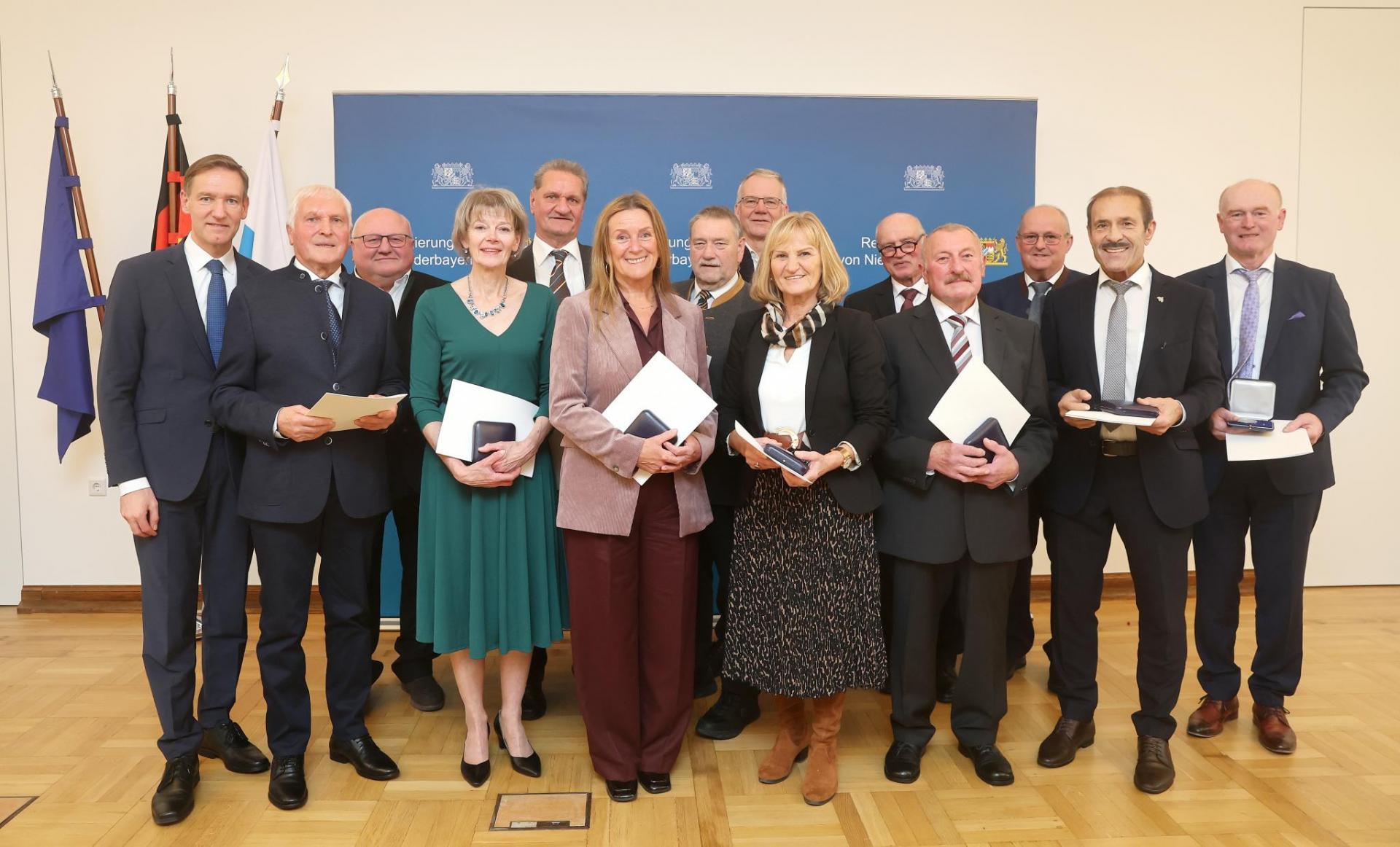 „Mit Ihrem Einsatz halten Sie die Demokratie lebendig und das Herz unserer Region am Schlagen": Für ihr herausragendes kommunalpolitisches Wirken hat Regierungspräsident Rainer Haselbeck (links) bei einer Feierstunde an der Regierung im Beisein zahlreicher Ehrengäste 13 niederbayerische Persönlichkeiten (im Bild), darunter langjährige Bürgermeister, Stadt-, Gemeinde- und Kreisräte, mit beeindruckenden Biographien, mit der „Kommunalen Verdienstmedaille in Bronze“ ausgezeichnet.