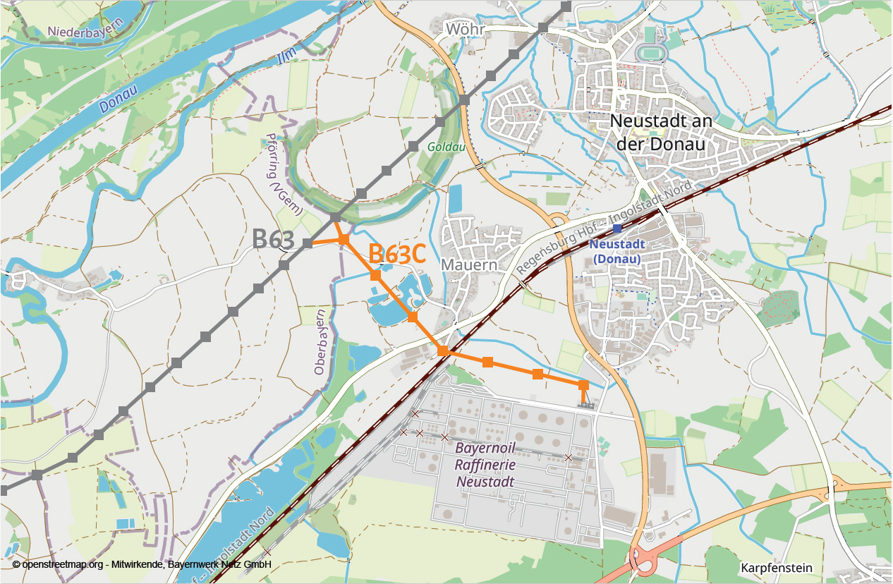 Die bestehende zweieinhalb Kilometer lange 110-kV-Freileitung verbindet das Umspannwerk Neustadt an der Donau mit der 110-kV-Leitung Ingolstadt – Sittling (Leitungsnummer B63). Die Leitung verläuft im Landkreis Kelheim sowie in einem kurzen Abschnitt im Landkreis Eichstätt. Die Bayernwerk Netz GmbH plant einen Ersatzneubau, in dessen Rahmen die bestehenden sieben Masten an ihren bisherigen Standorten ersetzt werden.