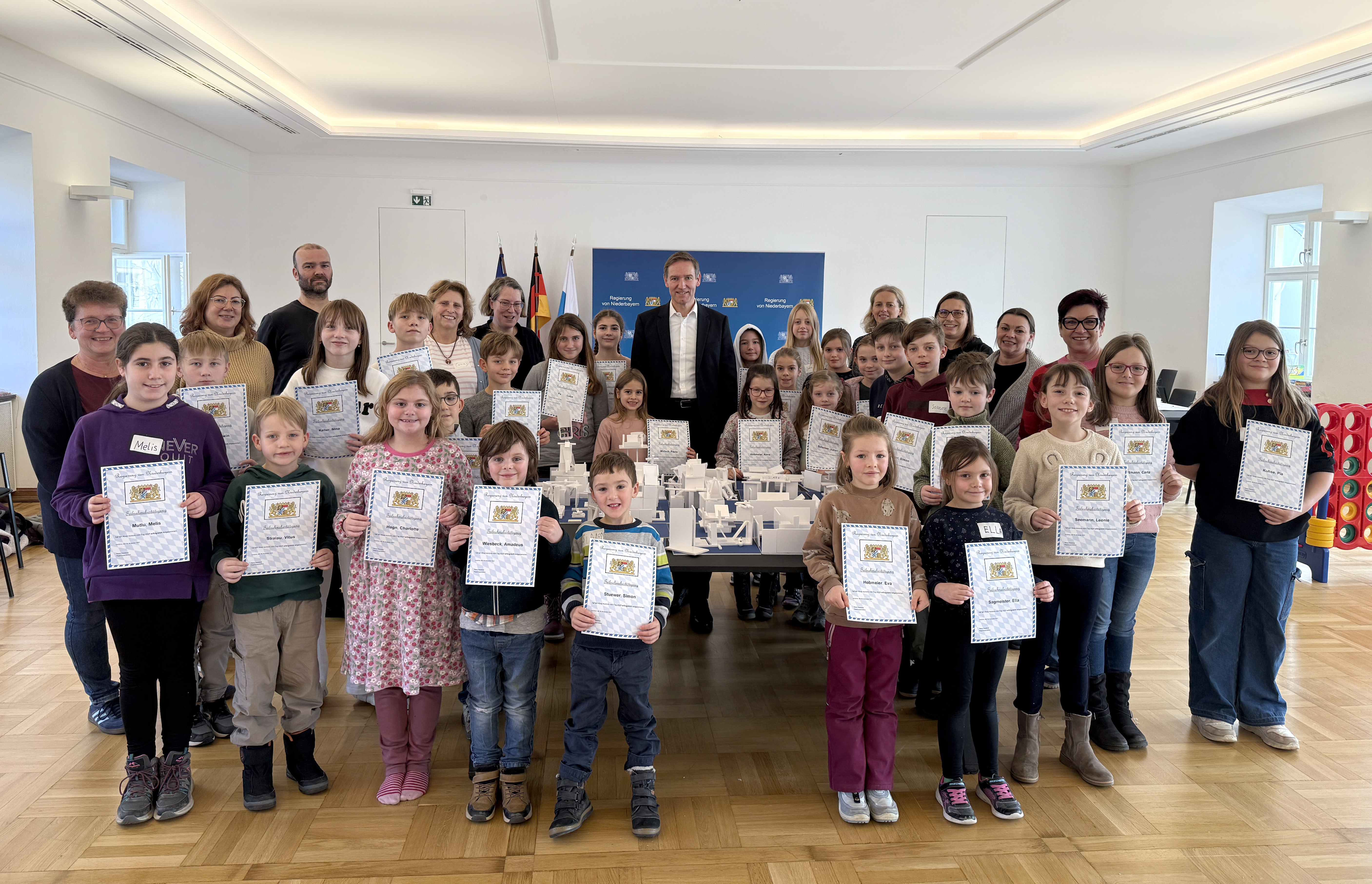 Am Mittwoch hat sich der „Große Sitzungssaal“ an der Regierung von Niederbayern in einen lebhaften Abenteuer-Treffpunkt für Kinder verwandelt: Am schulfreien Buß- und Bettag, der auch in diesem Jahr viele Eltern vor organisatorische Herausforderungen stellt, durfte der Nachwuchs der Regierungsbeschäftigten wieder einfach mit zur Arbeit. Der von Regierungspräsident Rainer Haselbeck (Mitte) hochgehaltene, mittlerweile traditionelle „Kind-kommt-mit-Tag“ an der Regierung unterstreicht einmal mehr deren Familienfreundlichkeit und wie sehr die Behörde ihre Mitarbeiterinnen und Mitarbeiter wertschätzt: „Unsere Beschäftigten sind das Herz unserer Behörde. Mit dem „Kind-kommt-mit-Tag“ möchten wir die Eltern unterstützen und ihnen ein verlässliches Angebot bieten, das sie entlastet und das ihren Kindern zugleich eine Freude bereiten soll. Wenn am Ende des Tages alle glücklich nach Hause gehen, dann haben wir viel erreicht“, bekräftigte der Regierungspräsident. Geht es nach den kleinen Besuchern, wurde das gesteckte Ziel jedenfalls sichtlich übertroffen. Auf die Frage des Regierungspräsidenten, wie ihnen der Tag gefallen habe, gab es eine gleichzeitig erklingende und stimmgewaltige „sehr gut und super“-Antwort. Dank der Gleichstellungsbeauftragten der Regierung, Michaela Eichhorn (links), und der Unterstützung freiwilliger Fachkräfte, wie Haselbeck wertschätzend hervorhob, die ihm zufolge auch in diesem Jahr wieder ein umfassendes „Rundum-Sorglos-Paket“ geschnürt haben. Der Nachwuchs der Beschäftigten konnte sich kreativ austoben, gemeinsam spielen und an verschiedenen Aktivitäten teilnehmen. Ein echtes Highlight, das alle begeisterte: Eine spannende morgendliche Erkundungstour mit Siglinde Brams durchs Stadtgebiet unter dem Titel „Architektour“ – gefolgt vom kreativen Bau eigener 3-D-Modelle (im Bild) am Nachmittag. Als kleine Erinnerung an den erlebnisreichen Tag gab es für die Kinder eine Teilnehmerurkunde, die sie – persönlich von Regierungspräsident Rainer Haselbeck überreicht – sichtlich stolz entgegennahmen.