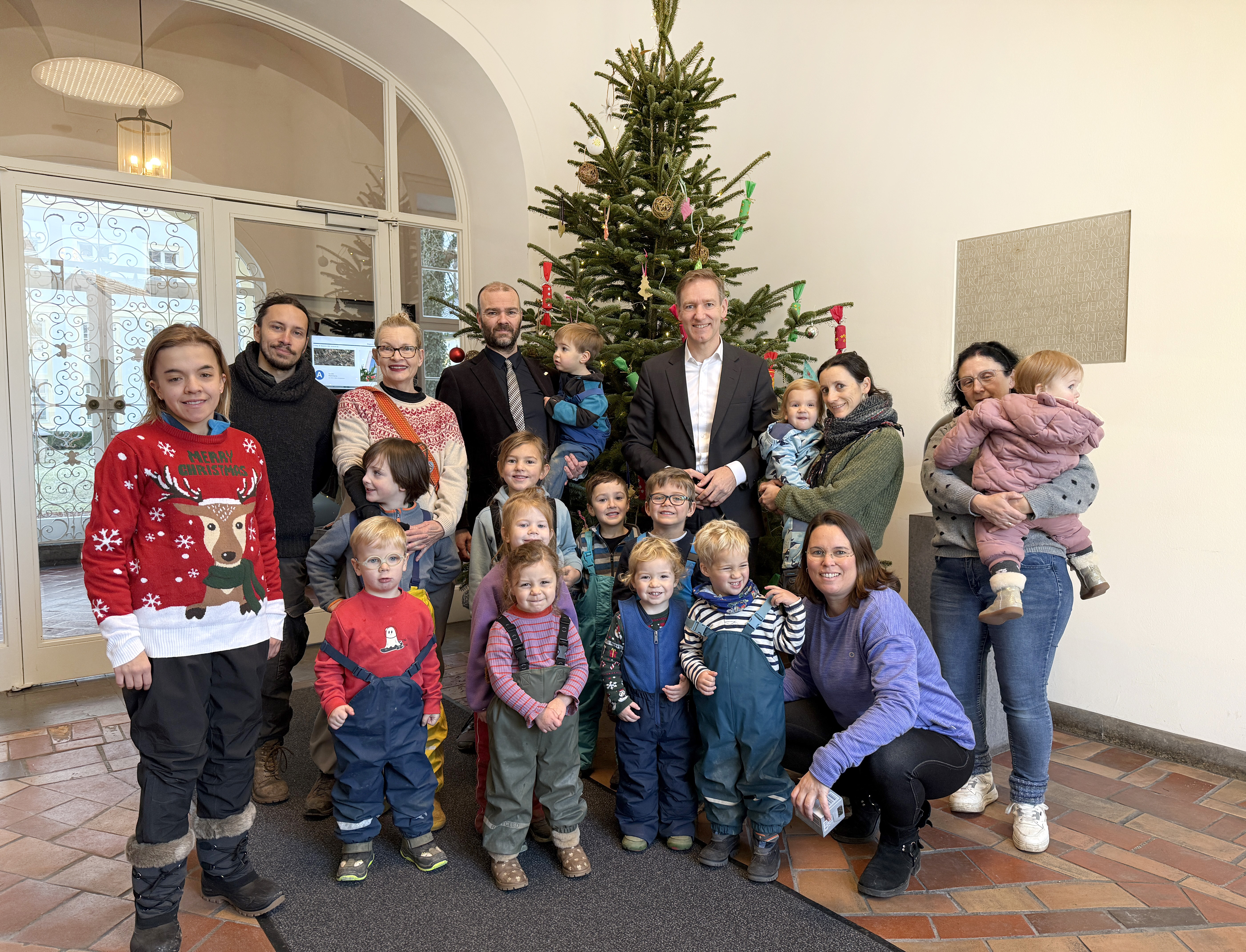 Schon beim Eintreffen war die Vorfreude groß: „Oh, der ist ja riesig!“, staunte eines der rund 20 Kinder, als es die über dreieinhalb Meter hohe Tanne im Eingangsbereich entdeckte – um sich sodann gemeinsam und mit großer Begeisterung der Aufgabe zu stellen, den prächtigen Regierungschristbaum in ein strahlendes Festtagskleid zu verwandeln.