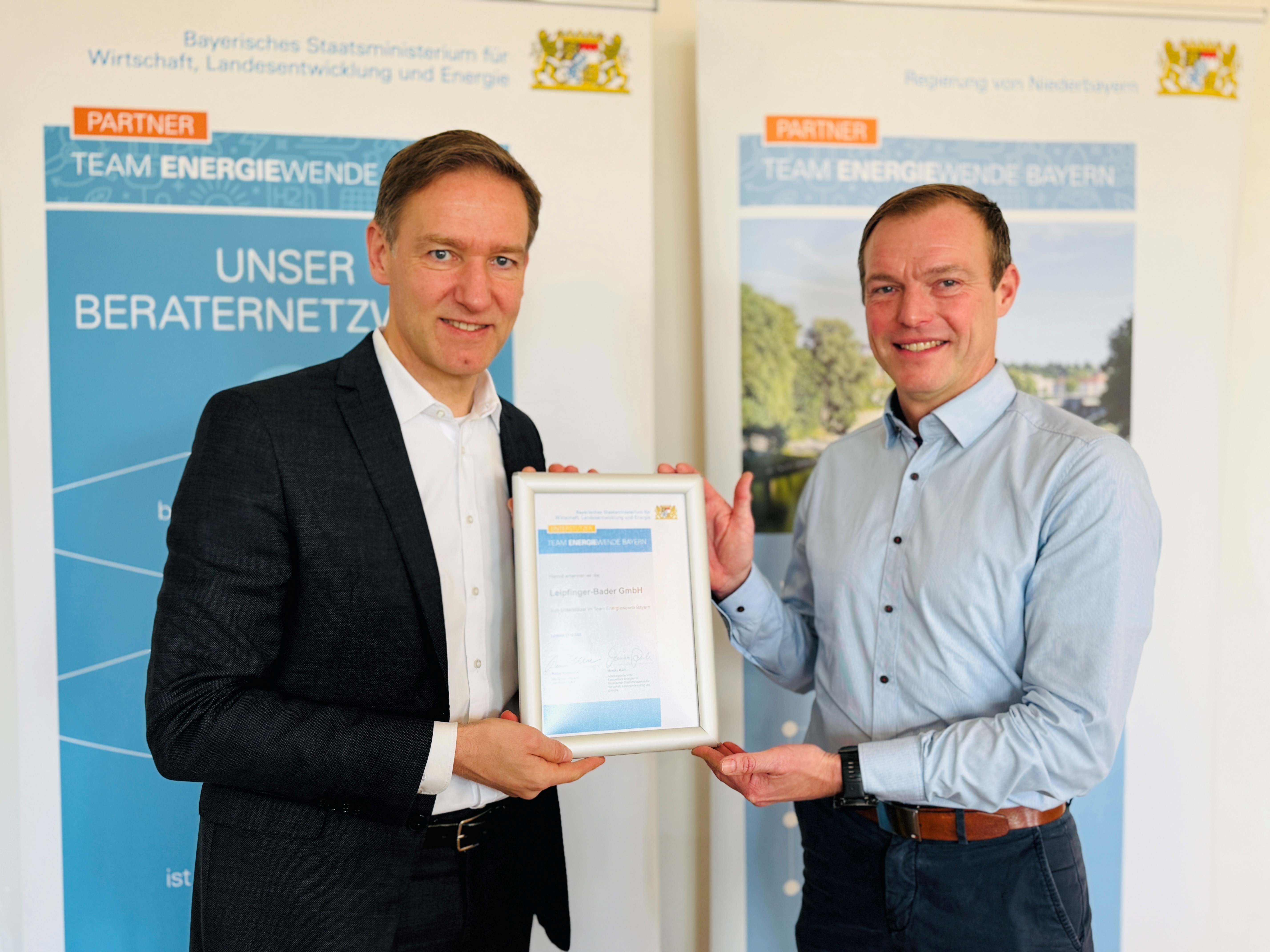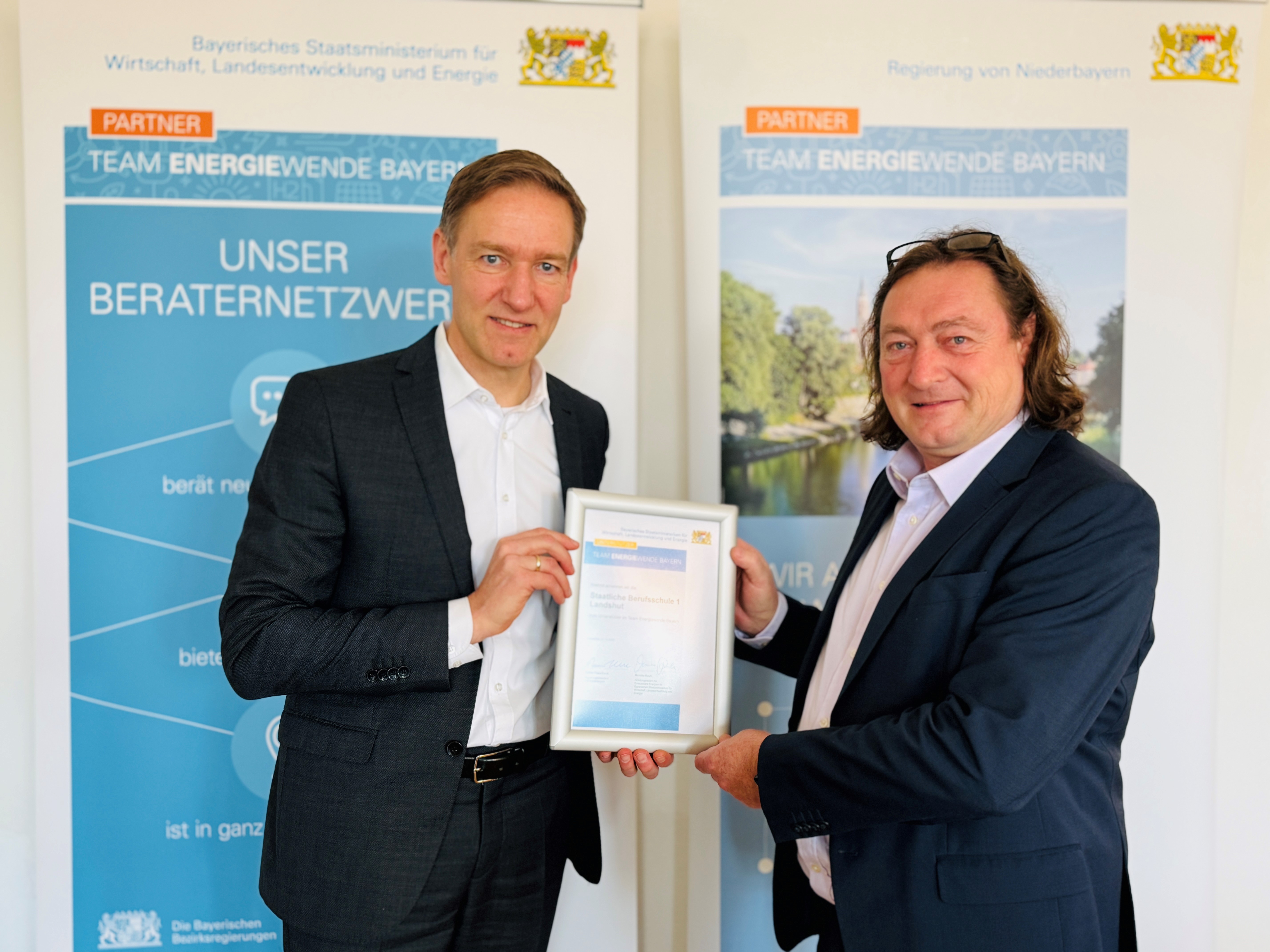 Niederbayern behauptet seine absolute Spitzenposition in Sachen regenerative Energien in Bayern und baut seine Vorreiterrolle konsequent aus: Am Montag hieß Regierungspräsident Rainer Haselbeck zwei weitere engagierte Partner willkommen, die das „Team Energiewende Bayern“ – eine Initiative des Bayerischen Wirtschaftsministeriums – von Landshut aus verstärken: die als Klimaschule zertifizierte Staatliche Berufsschule 1 und das mehrfach für Nachhaltigkeit-, Umwelt- und Klimaschutz ausgezeichnete Familienunternehmen „Leipfinger-Bader“. Bei der Übergabe der offiziellen „Unterstützer“-Urkunden an den Berufsschulleiter Reinhold Ostermaier und den Projektleiter „Energie und Nachhaltigkeit“ bei Leipfinger-Bader, Michael Schippler, würdigte der Regierungspräsident deren besonderes Engagement, das in vielseitigen Projekten zum Ausdruck kommt: „Fortschritt bei der Energiewende braucht Zusammenarbeit. Sie gehen mit gutem Beispiel voran und lassen Taten sprechen. Genau das ist entscheidend, denn jeder einzelne Beitrag ist ein Schritt nach vorn. Danke für Ihren Einsatz.“